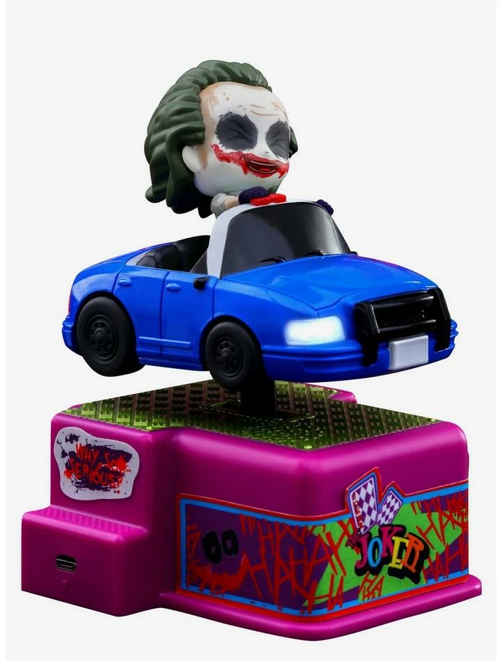 Sideshow and Hot Toys present the DC CosRider series The Joker CosRider from The Dark Knight. Each collectible in the series measures approximately 11 to 13.5cm tall. Features coin-operated mechanical design, original music tune, LED light-up function, built-in rocking motion, and movie-theme stickers for fans to customize the whole design. CosRider in the same series can even be coupled up and rock together in the fun melody of Hot Toys original.