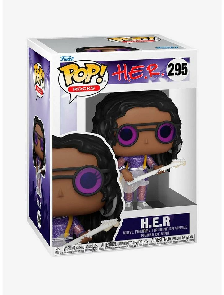 R&B artist H.E.R. has gotten a Funko makeover to commemorate an iconic performance of her career. She wears a sparkly, translucent purple outfit with her signature dark shades as seen in her 2019 Grammys performance, shredding on a clear-bodied electric guitar.
