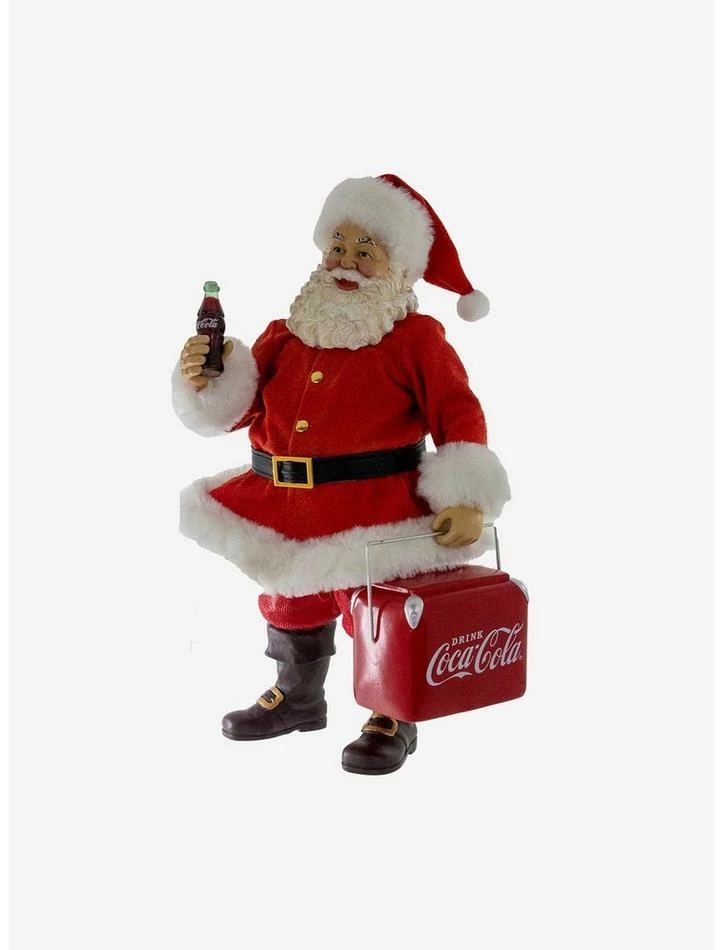 Part of Kurt Adler’s Fabriche collection, this 10.5-inch Coca-Cola Santa with cooler table piece is a festive addition to any holiday decor. Santa Claus is featured in a red and white Santa suit with matching Santa hat and black boots. In one hand he is holding a bottle of Coca-Cola and in the other a red “Coca-Cola” cooler.