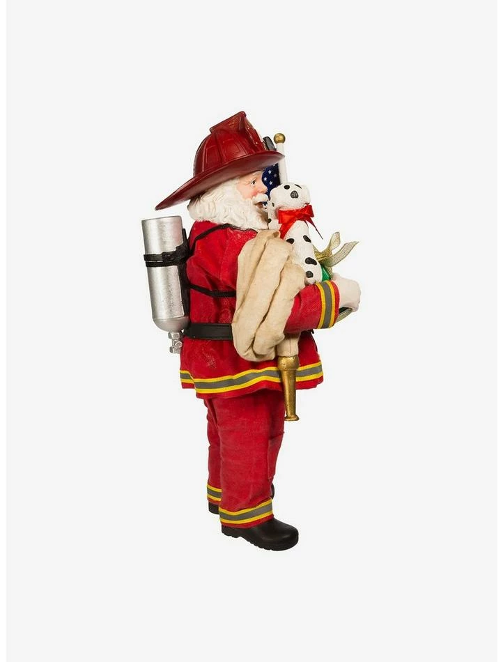 Part of Kurt Adler’s Fabriche collection, this 10.5-inch Fireman Santa is a fun and festive addition to any holiday decor. Santa Claus is featured in a Fireman’s coat, pants and hat holding an American flag in one hand and in the other he is holding a Dalmatian and gift box.
