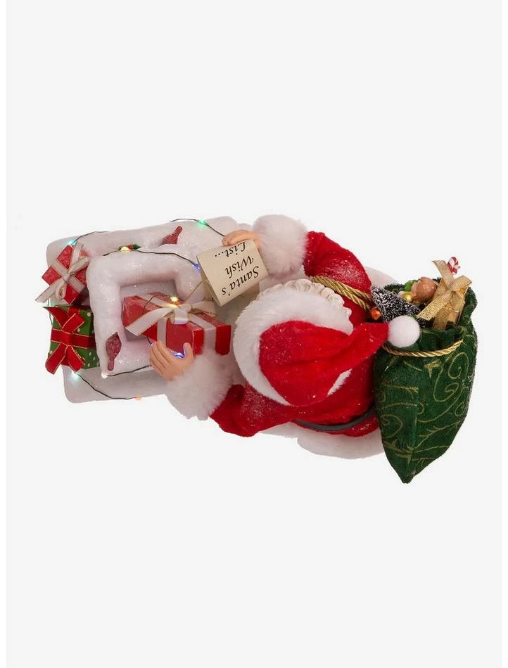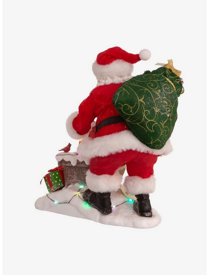 It is the night before Christmas and Santa is busy making his rounds dressed in his classic fur trimmed red suit and hat. This 10.5-inch Fabriche battery-operated Santa Next To Lit Chimney from Kurt Adler features Santa standing next to a snowy chimney decorated with small LED lights to help guide his way. The lights will need batteries that are not included. He is the perfect addition to any Santa collection. This exclusive design is meticulously made using our traditional techniques of mixed media, pvc, resin and authentic Fabriche fabric
