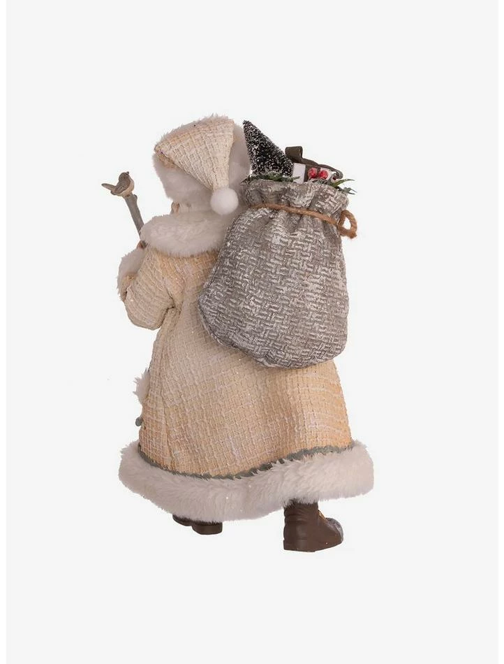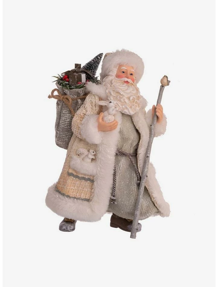 Old fashioned Santa slowly walking through the snowy woods accompanied by some wee forest friends with 10.5-inch Fabriche Snowy Woods Santa from Kurt Adler. He holds a tiny bunny with a small squirrel peaking out of his pocket and tiny bird sits on his staff. There is a magical peaceful quality about the design that evokes the wonders of winter and is reminiscent of Christmas Past. There is a wonderful nostalgic feeling about the design. The colors are shades of white, ivory, grey and beige. He would look grand in a Victorian or woodland setting. He is meticulously hand crafted with exceptional attention to detail and dressed in our authentic Fabriche fabric. His face has an usually kind expression that is peaceful and kind.