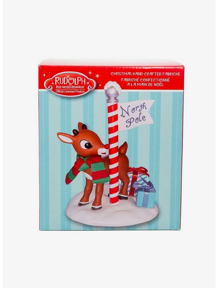 This 6.5-inch Fabriche Rudolph North Pole Table Piece from Kurt Adler is a fun and festive way to celebrate the holiday season. This officially licensed Rudolph table piece features Rudolph wearing a red and white scarf, he is standing next to the north pole with decorated presents at his hooves. The perfect addition to any Rudolph collection!