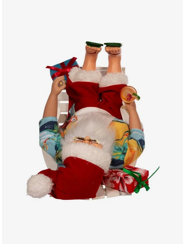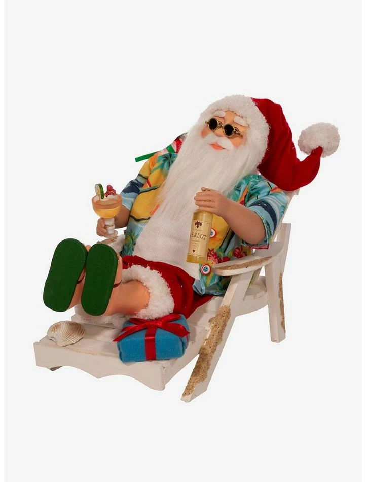 This 11.5-inch Santa Beach Chair Table Decor from Kurt Adler is a fun and festive addition to any holiday decor. Part of the Kringle Klaus collection, Santa is featured here wearing his beach attire and sunglasses and sitting in a white beach chair. In one hand is a bottle of Merlot and in his other hand is a cocktail.