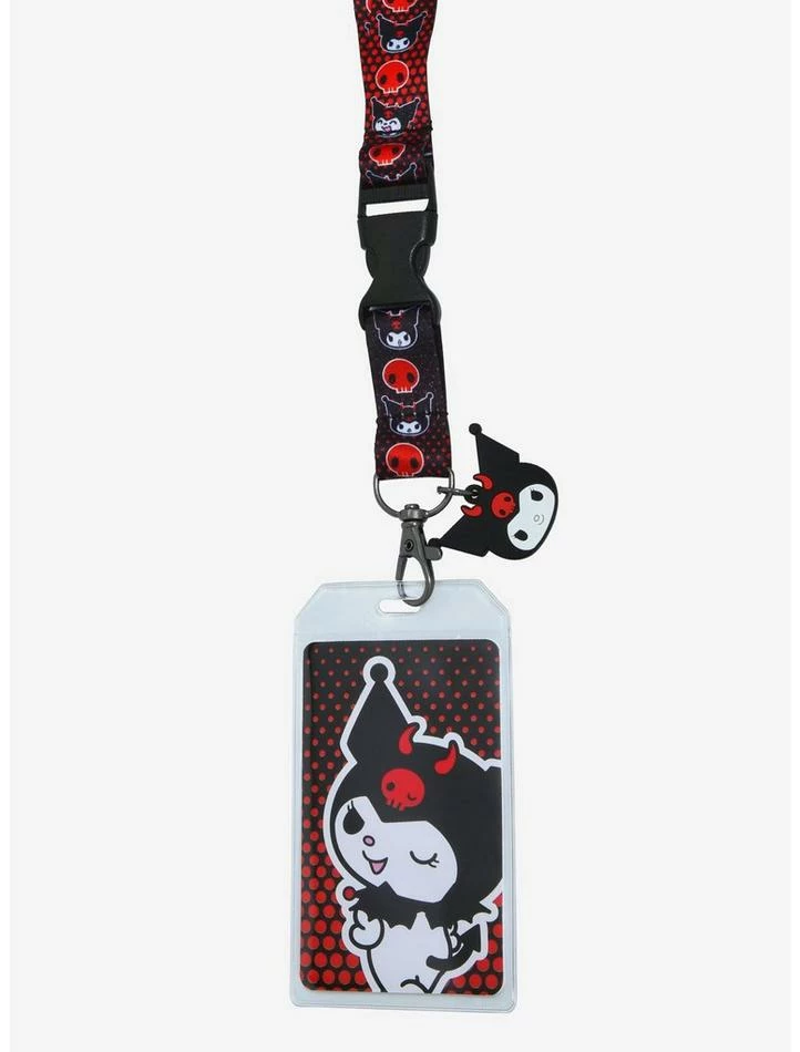 Keep your essentials secured with this devilishly cute lanyard! Your favorite Sanrio character is featured all over this black & red lanyard, with Kuromi sporting devil horns and her signature skull printed all over. Comes with an additional Kuromi devil charm, a detachable buckle and a clear ID holder.