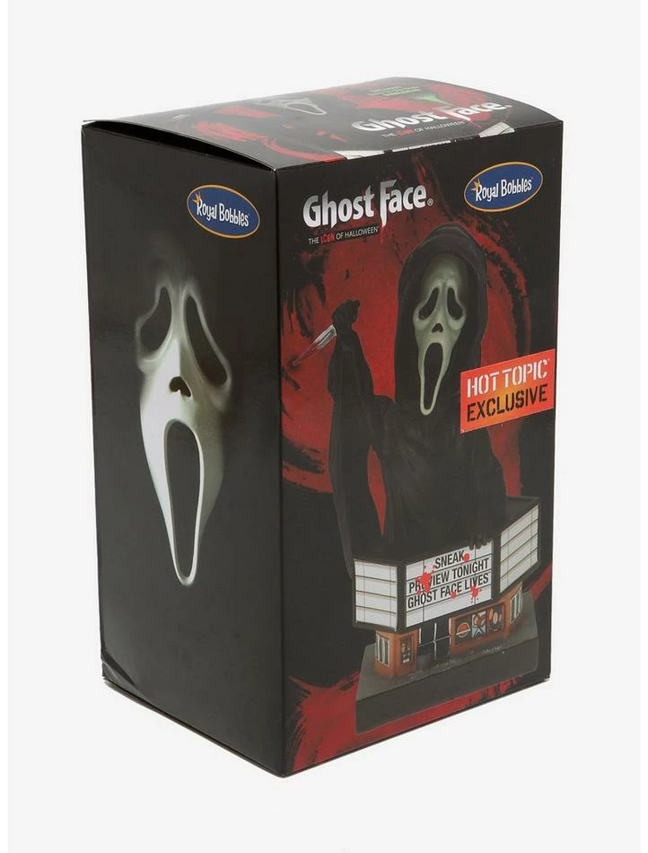 Wanna watch a scary movie? Join Ghost Face for a date night with this glow-in-the-darkย Scream bobblehead from Royal Bobbles. Featuring Ghost Face holding a bloody knife, over a movie theater with “Sneak preview tonight Ghost Face lives” on the marquee.ย