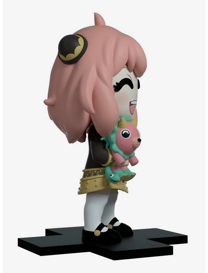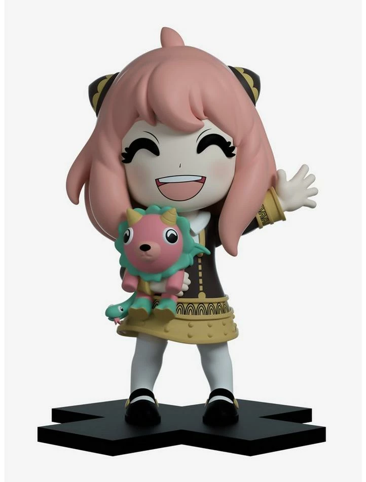 Anya has escaped from her barricaded room and tailed her parents all the way to your Youtooz collection! The worldβs cutest telepath is depicted with an arm outstretched in an excited wave and the biggest smile shining from her adorable face. Dressed in the uniform of her prestigious school, she wears a white collared shirt with a red bow and fancy dress with gold embellishments. Accompanied by her beloved pink and green Chimera plush hugged tightly to her chest, sheβs always ready for the most spectacular spy adventure, whether that be saving the city or simply sneaking another bag of peanuts to her room.