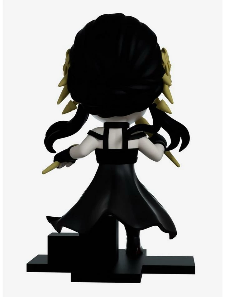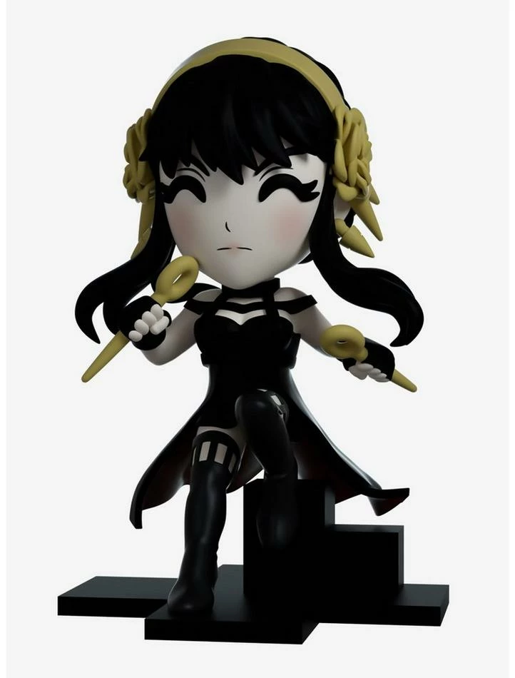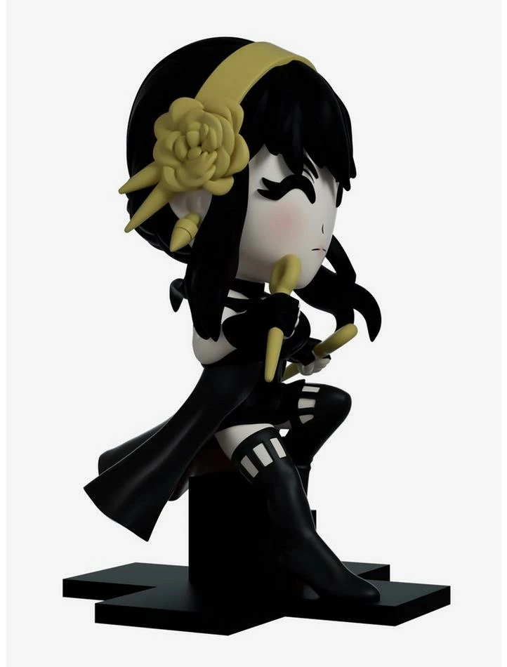 Office clerk by day and deadly assassin by night, Yor accepts her contract to infiltrate your Youtooz collection! The fearsome Thorn Princess is posed wielding a deadly golden needle in each hand as she lands gracefully with her elegant black dress flowing back to reveal its red interior. Her long black hair sits under a stunning gold flower headband and falls in two long strands to frame her determined blushing face, while the rest is held in place with thick braids around the back of her head.Β